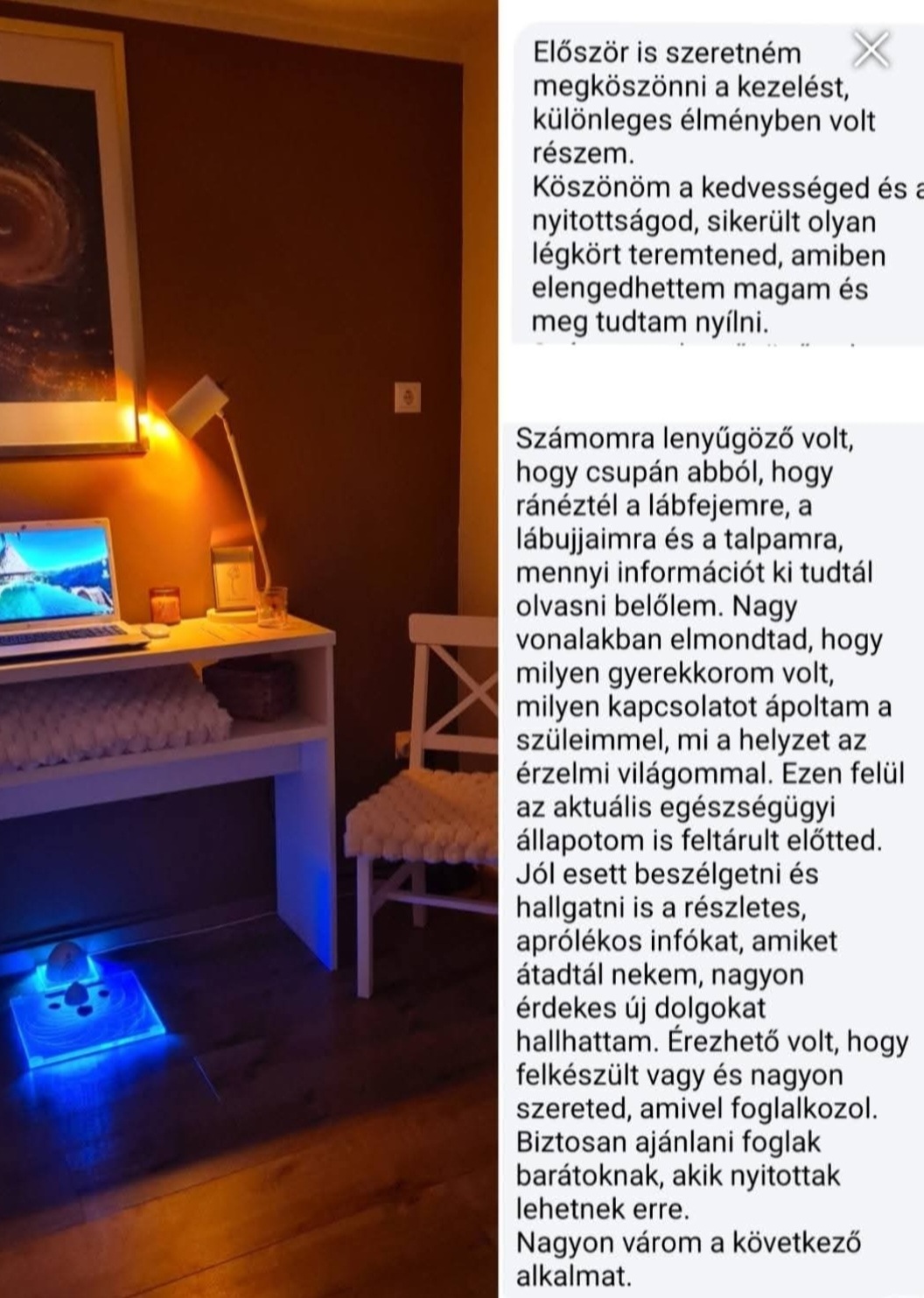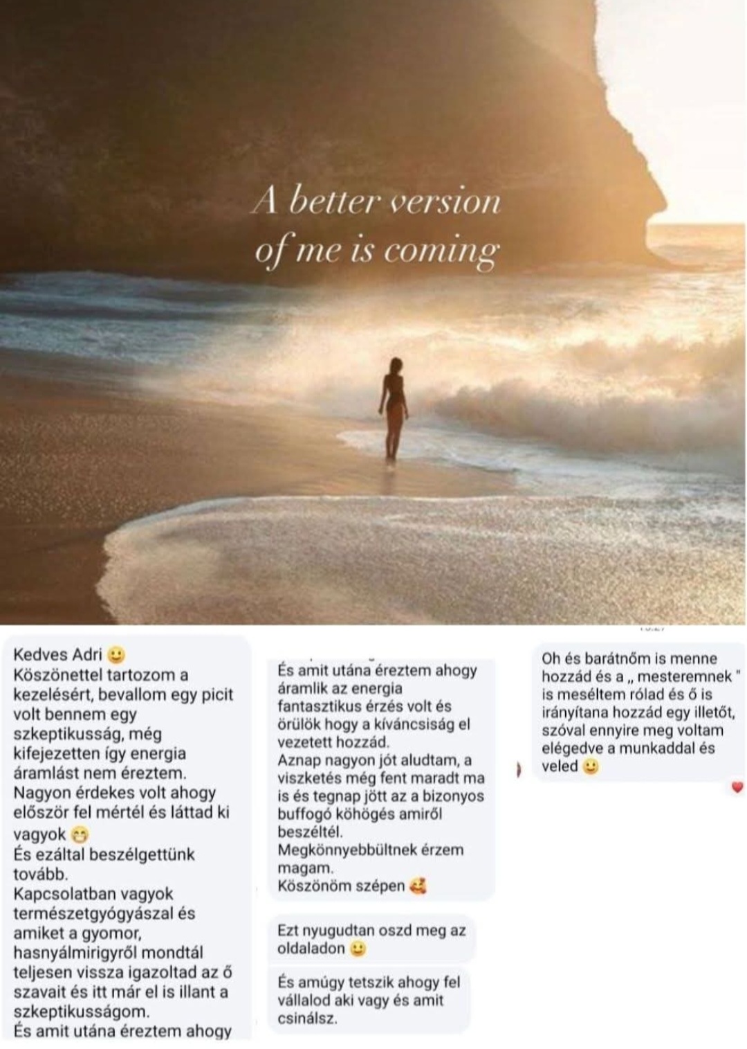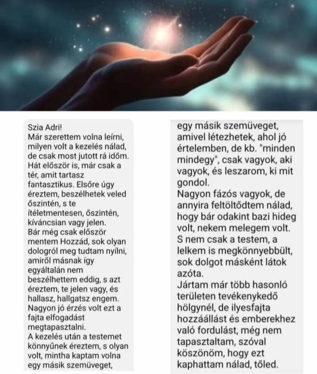 Közzétéve itt: Emese Nagy2026.04.16.A Trustindex hitelesíti, hogy a vélemény eredeti forrása Google. Finom kezelés testnek és léleknek egyaránt. Adri nagyon profi és hamar visszaigazolja a belé vetett bizalmat.✨Közzétéve itt: Szilvia Lencse2026.04.01.A Trustindex hitelesíti, hogy a vélemény eredeti forrása Google. Csak is ajánlani tudom, én Harmonikus regeneráción jártam Adrinál. Az első kezelésre lestrapáltan érkeztem , de a végére feltöltve ''lebegve" 😁 távoztam. Hihetetlen nagy tudással rendelkezik.Közzétéve itt: Péter Magyar2026.03.20.A Trustindex hitelesíti, hogy a vélemény eredeti forrása Google. A környezet nagyon kellemes, otthonos, jó belépni hozzá. Adri nagyon profi, mindig tudja hogy mit kell csinálnia. Kezelésről kezelésre kaptam tőle mindig valami pluszt. Mindenkinek azt ajánlom, hogy legyen türelmes, kitartó és ne csak egy-két alkalom alapján alkosson róla véleményt. Minden test más, így mindenki máshogy reagál, gyógyul, szóval sok kitartást és jó egészséget kívánok mindenkinek!Közzétéve itt: Beata Mlaka2026.02.21.A Trustindex hitelesíti, hogy a vélemény eredeti forrása Google. Ezt nem lehet leírni, ezt ki kell próbálni!Közzétéve itt: Adrienn Magyar2025.03.06.A Trustindex hitelesíti, hogy a vélemény eredeti forrása Google. Energetikai kezelésen voltam Adrinál. Kezdetben kicsit szkeptikus voltam, inkább magammal kapcsolatban, hogy fogok-e tapasztalni bármit is, annak ellenére, hogy amúgy egyértelműen energiáról egy létező dologról van szó, mivel mindenhol energia vesz minket körbe. Nekem akkora élményt adott, hogy mindenkinek azt javaslom, ha teheti egyszer mindenképpen menjen el és próbálja ki! Elképesztő, hogy mit él át az ember! Testileg, lelkileg egy feltöltést kapunk. Esetleg olyan problémákra is fény derül (és azokhoz kapunk segítséget), amire nem is gondolnánk! Nekem ez egy csoda volt! Nagyon várom a következő alkalmat! Köszönöm szépen az eddigieket is! ♥️Közzétéve itt: Henrik Barsy2025.03.06.A Trustindex hitelesíti, hogy a vélemény eredeti forrása Google. Nagyon kellemes élmény volt a kezelés, és tanulságos. Köszönöm